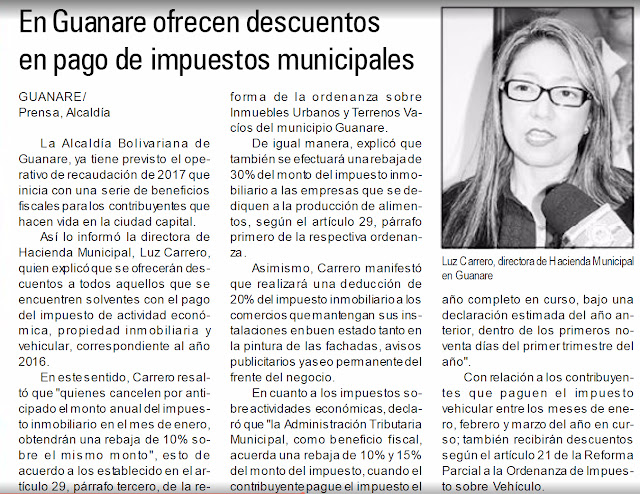 En nota de prensa publicada por el diario regional Última Hora en su edición del día 11-01-2017, en la Página 10 sección Generales, se destaca la asignación de diversos descuentos para la cancelación de tributos, aplicados para sector inmobiliario y vehículos entre otros.